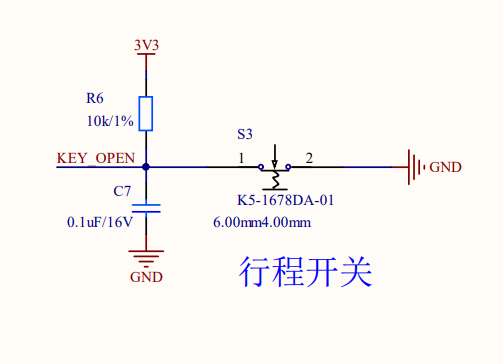 行程开关用于检测药盒外壳是否被打开。- 外壳处于关闭状态时,开关断开,“KEY_OPEN” 检测到高电平。