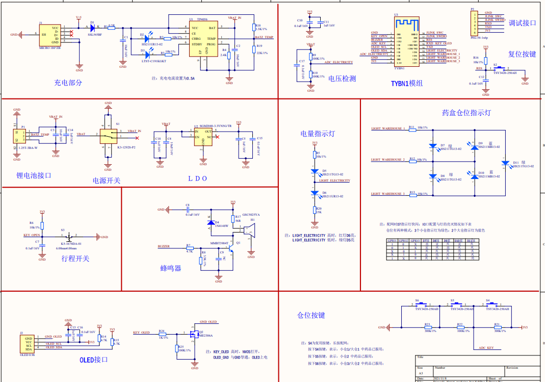 我们选取尺寸较小的电池以及静态功耗较低的芯片,以满足药盒的便携功能以及提高电池的续航能力。
