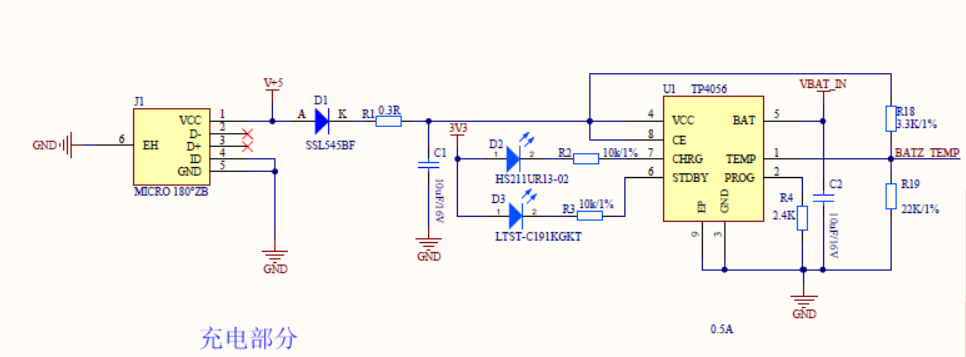 部件 说明 $$R_{TL}$$ 电池温度 TL 时的阻值。 $$R_{TH}$$ 电池温度 TH 时的阻值。 K1 电池温度 TH 时的阻值,为 0.45。 K2 为电池温度 TH 时的阻值,为 0.8。 $$R_{TL}$$ 电池的使用温度范围为 0℃ ~ 60℃,查询电池的 NTC 电阻的温度—阻值对应表可知$为 29.28KΩ。 $$R_{TH}$$ 电池的使用温度范围为 0℃ ~ 60℃,查询电池的 NTC 电阻的温度—阻值对应表可知$为 2.913KΩ。 R18 计算可得 R18=3.15KΩ(实际取 3.3K)。 R19 R19=22.05KΩ(实际取 22K)。 $$R_{PROG}$$ PROG 引脚外接的电阻。 恒流充电电流的计算方式: $$I_{BAT}=\frac{1200}{R_{PROG}}$$ 因此,本方案充电电流设计为 0.5A。