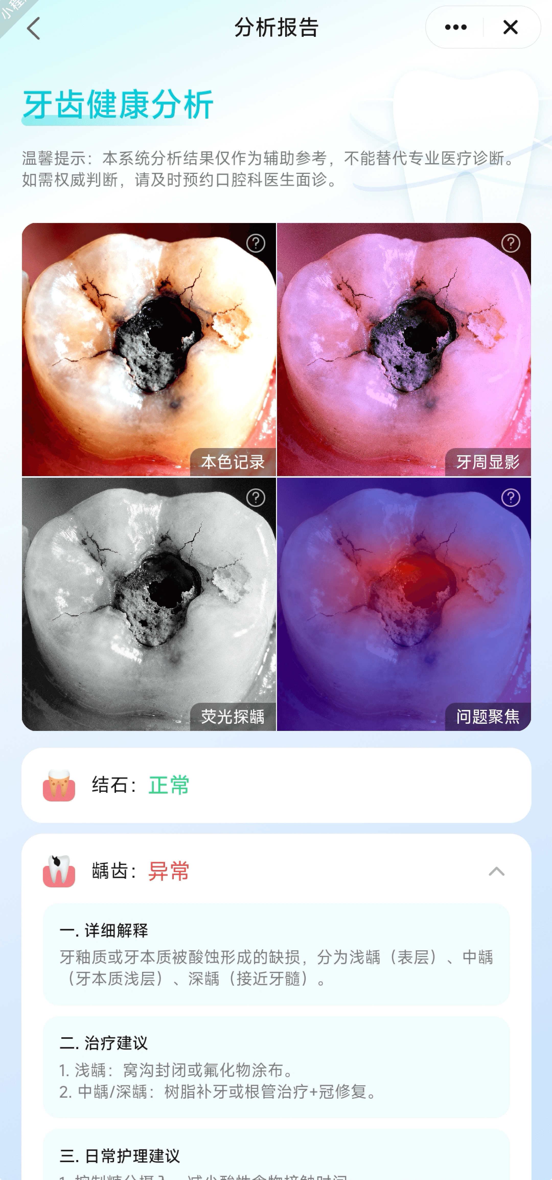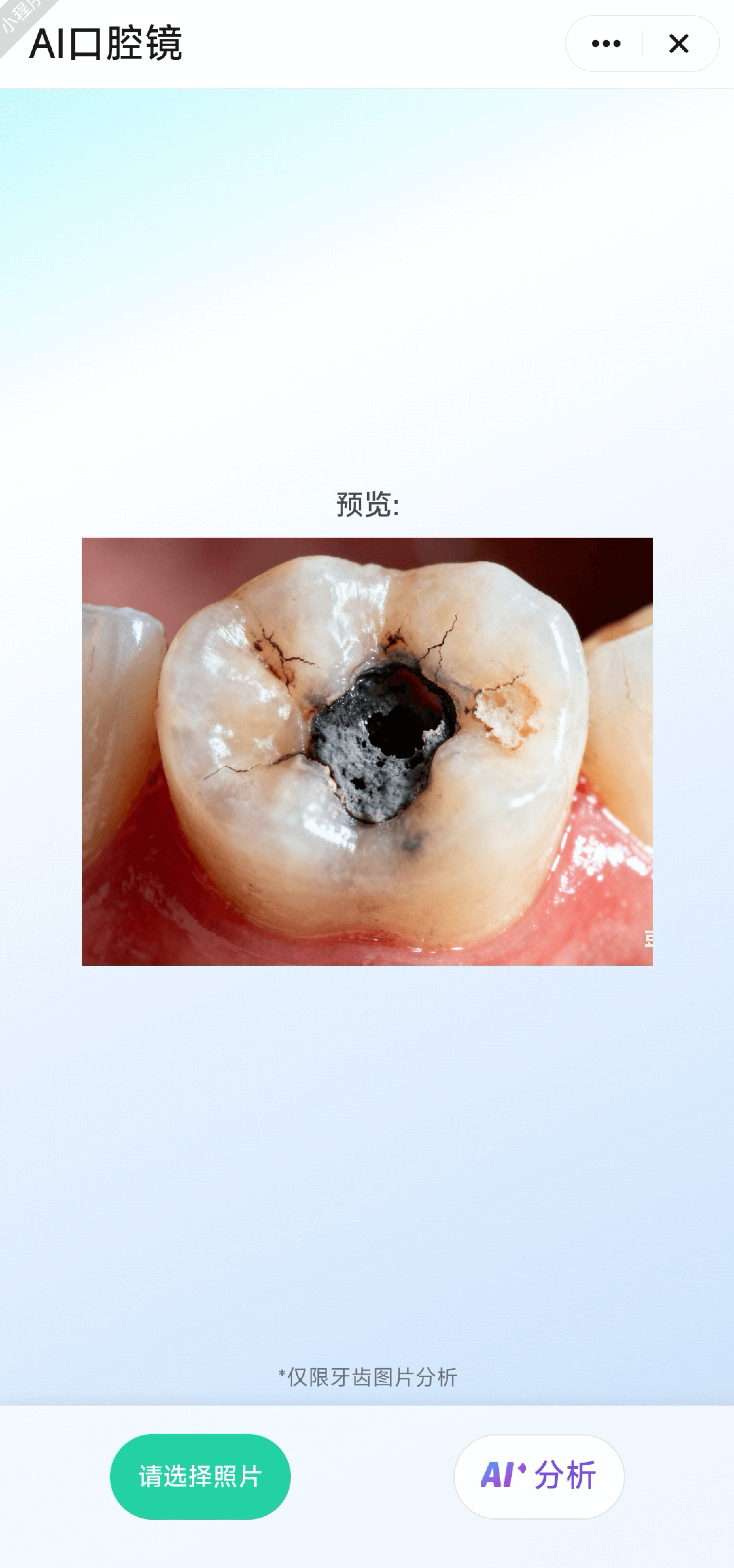 通过对照片进行 AI 分析,检测口腔疾病、处理图像显示热区并给出治疗建议。