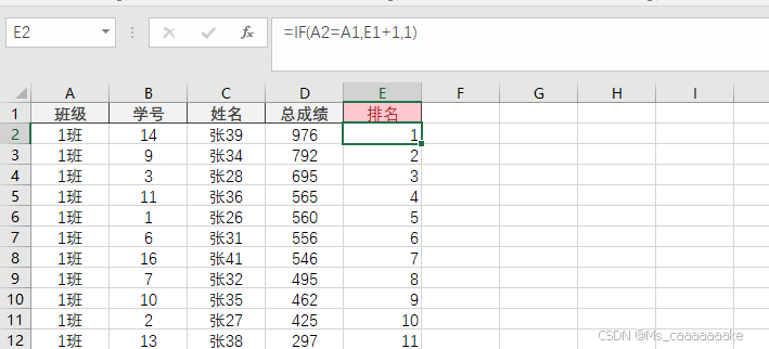 3、右边新增一列辅助列,填写公式,用来填充各班各学生排名
