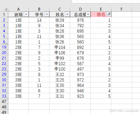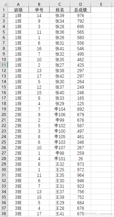 2、按照成绩降序排序,再按照班级升序/降序排序,得到每个班级按成绩顺序排序数据