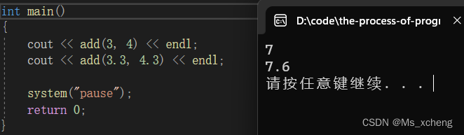 这样我们就会实现一个加法函数,可以看到我们的参数类型变成了T,是因为模板会自动识别我们输入的类型,所以我们就可以输入各种类型的数据,返回值也会自动变成我们想要的类型: