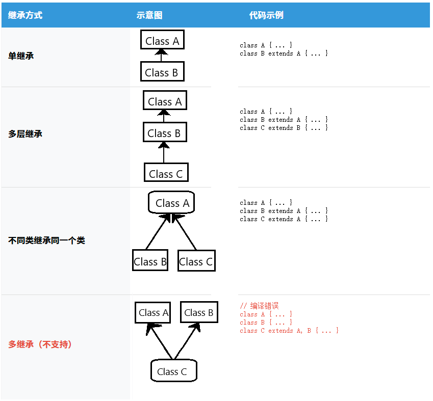 super 的调用不能跨级跳转。例如,当 C 类继承 B 类,B 类又继承 A 类时,C 类通过 super 只能访问直接父类 B 的方法,无法直接访问祖父类 A 的方法。- 禁止跨级语法(super.super)