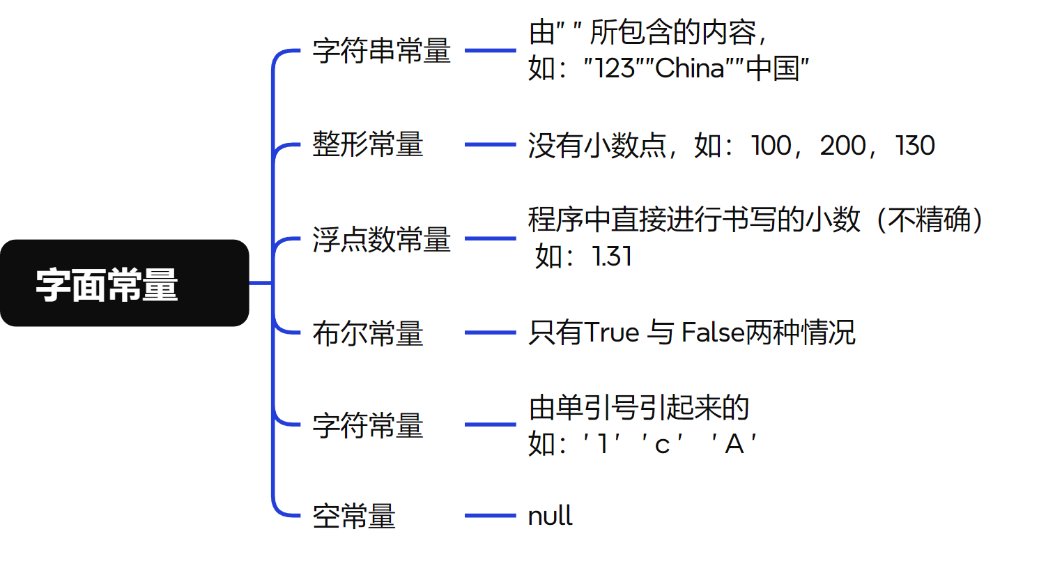 - 就是在程序中被直接写出来的固定值,例如:123,3.14、' a '