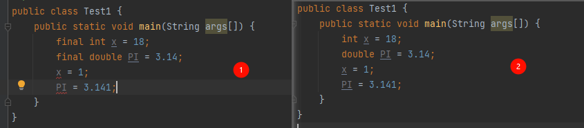 从截图 ① 可以看见,如果使用了 final 修饰了变量,那么其值就不可被再次修改,而 ② 没有使用 final 对变量进行修饰,则 x 与 PI 便可以被修改。