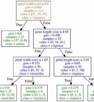 当我们用上面代码训练模型时(使用花瓣长和宽做特征,决策树深度设为3),可能得到如下模型图
