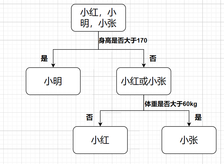 假如有小明,小红和小张三个人,我们知道他们的身高体重,要通过身高体重来判断是哪个人,决策树算法会构建一个二叉树,逐级判断,如下