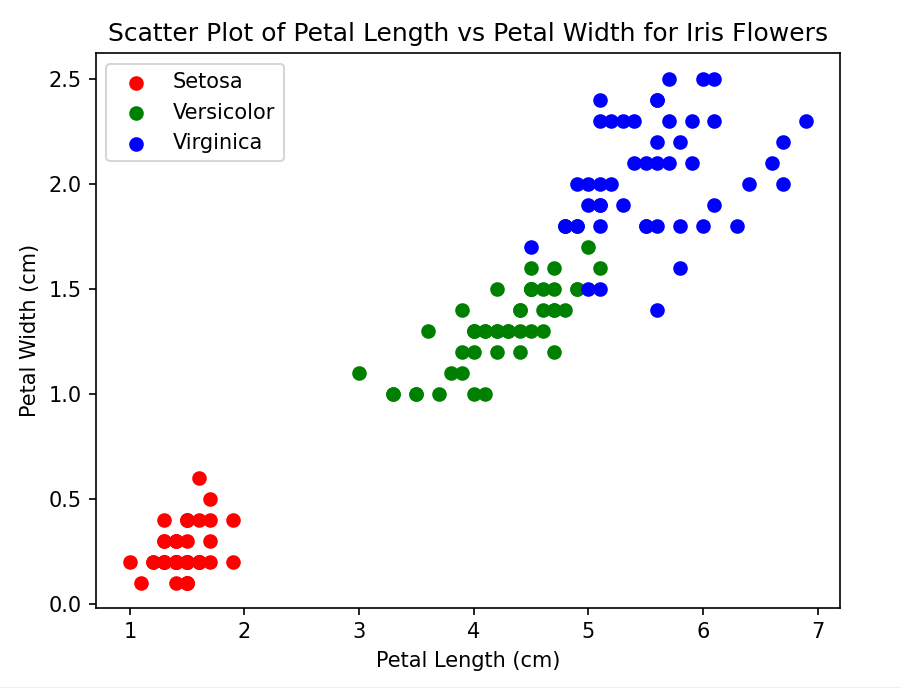 绘制花瓣长与宽的关系图,我们发现不同颜色的点基本上被区分在了不同的区域,这代表着不同种类的鸢尾花的花瓣长宽有很大区别,所以花瓣的长与宽是两个强特征,让我们用这两个特征来进行模型训练吧。