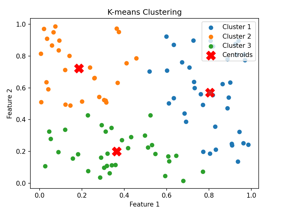 生成随机数据: 使用NumPy生成一个包含100个数据点的二维数组,每个数据点有两个特征。