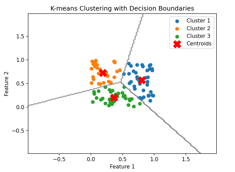 KMeans对象,指定簇的数量,然后使用fit方法拟合数据。模型训练完成后,每个数据点将被分配到一个簇,并且簇中心点将被计算。 -