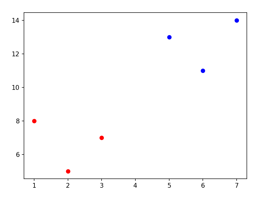 X = [[1, 8], [2, 5], [3, 7], [5, 13], [6, 11], [7, 14]]