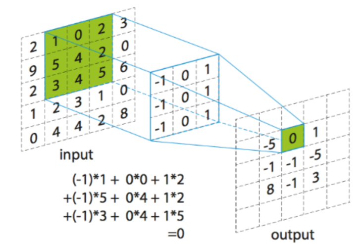 这张图显示了一个滤波器的某时刻的运作过程,最左边的是原图,中间是滤波器,最右边是结果,它会进行一个内积运算,图中也展示了这个过程