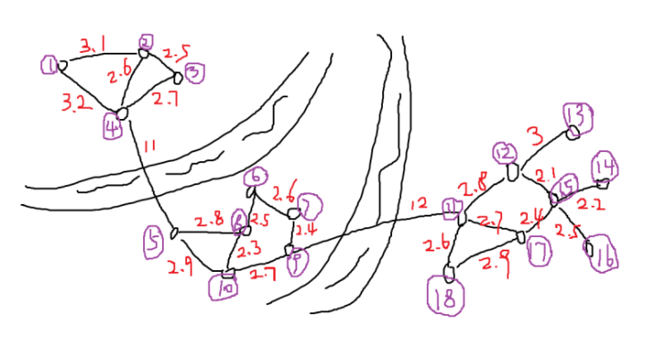 1. 如示意图所示,这里表示有3个大的区域A,B,C。其中标号的点代表人员聚集小区(这里把1个小区假设为一个点),边上的数值代表两点的距离(单位公里)。假设我们要在这些人员聚集区建设4个核酸检测点,请建立数学模型分析,4个核酸检测点应该设置在什么地方是最好的,并说明理由。