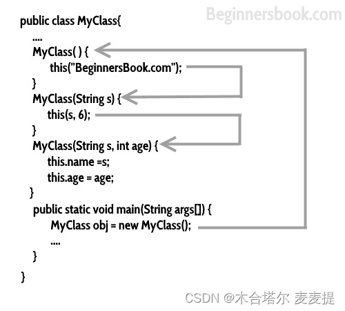 当一个构造函数调用同一类的另一个构造函数时,这被称为构造函数链接。在上图中,您可以看到默认构造函数在内部调用具有字符串参数的构造函数,此构造函数再次调用具有两个参数的不同构造函数。这是构造函数链接的一个示例。