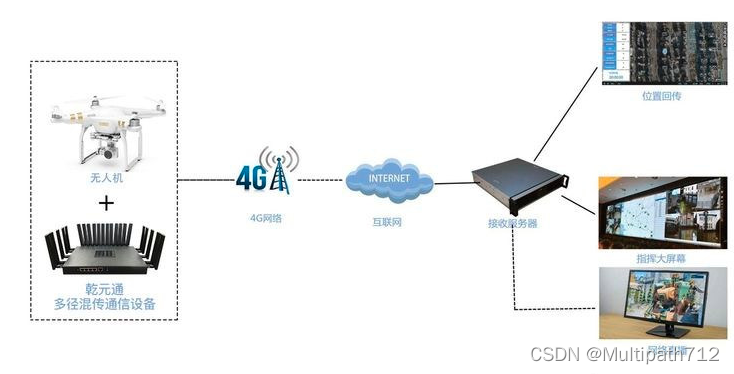 无人机的控制端通过无线网络的方式与4G多卡聚合智能融合通信设备连接将高质量实时视频经由Internet传输至云端进行处理,再推送到视频播放端,真正实现高清无卡顿的随时随地直播。乾元通QYT-X1S 4G多卡聚合智能融合通信设备将一个视频在发射端拆解后通过多个通道传输到一个服务器端重新组合之后再推送到视频播放端,整个传输过程通过多个通道来完成,保障在某个单个网络不好的情况下多个网络聚合后传输的稳定性,当然整个传输过程也不是那么简单,传输的方式虽说很简单,但是要保证传输的稳定,就必须做到能实时分析和预判每个链路的网络质量,从而自动的分配每个链路的传输数据比例分配,最终安全稳定的完成视频直播的传输。