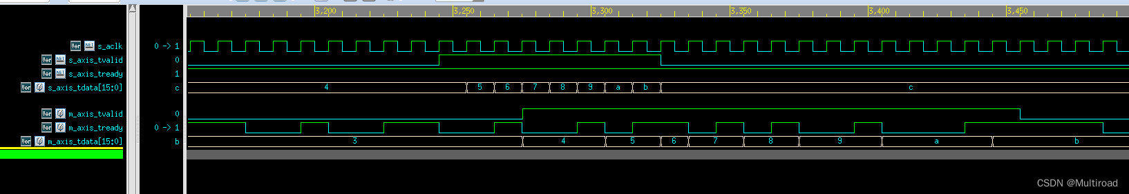 从上图可以看出,只要fifo内存在有效数据,tvalid就会有效,但是只有ready信号有效的时候,输出信号tdata更新。