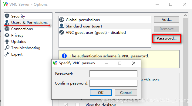 3.使用VNC密码时,要进到如下界面进行设置,点击password,输入你想要的设定的密码即可