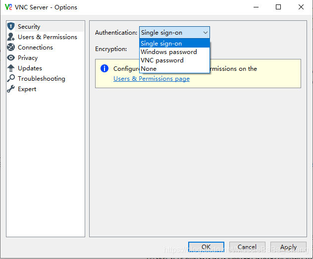有四种认证方式,第一种SSO不建议在任何场景下使用,第二种Windows password是在远程访问时,需要输入被访问系统的开机密码,如果没有开机密码,那你不论输入啥都访问不进去,第三种是VNC密码,这种完全是VNC自己的密码,可以自定义任何密码,然后记住即可,第四种是没有密码,也就是只要IP对了,随便访问