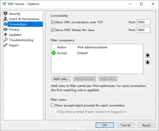 4.端口问题,VNC默认的连接端口一般为5900,如果想要自定义,也可以在connections里去改,不过你在远程访问时,需要加上具体的端口号