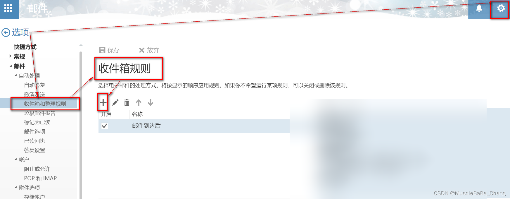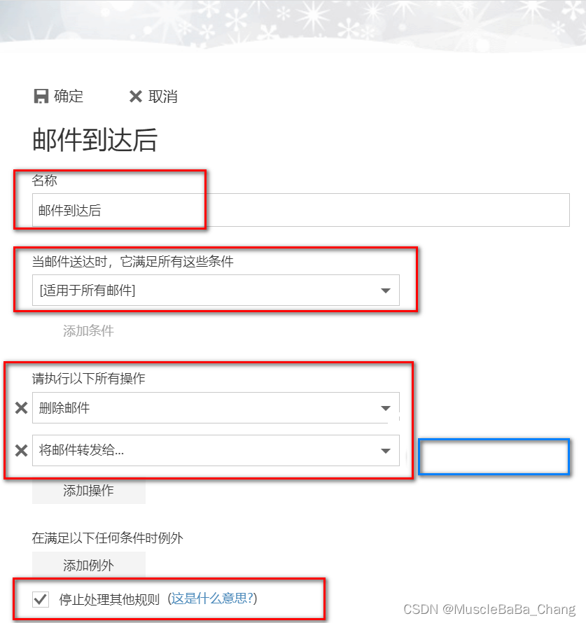 3.编辑规则,主要为所有邮件到达后,执行把邮件转发给蓝色框内的邮件地址,然后删除邮件,不占用邮箱空间。
