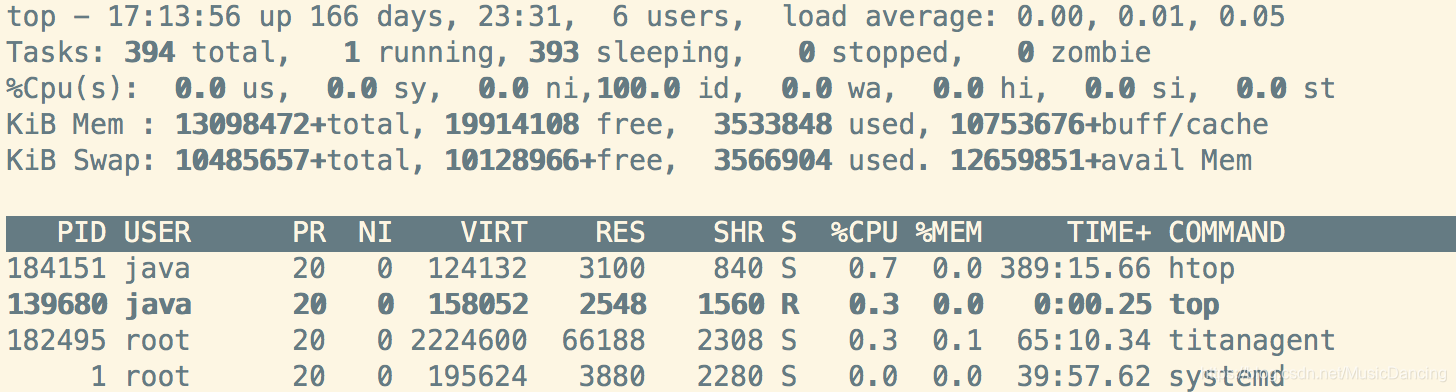 Mem: 物理内存; Swap: 虚拟内存(最好不要超过20%,系统使用到swap说明物理内存不足)。