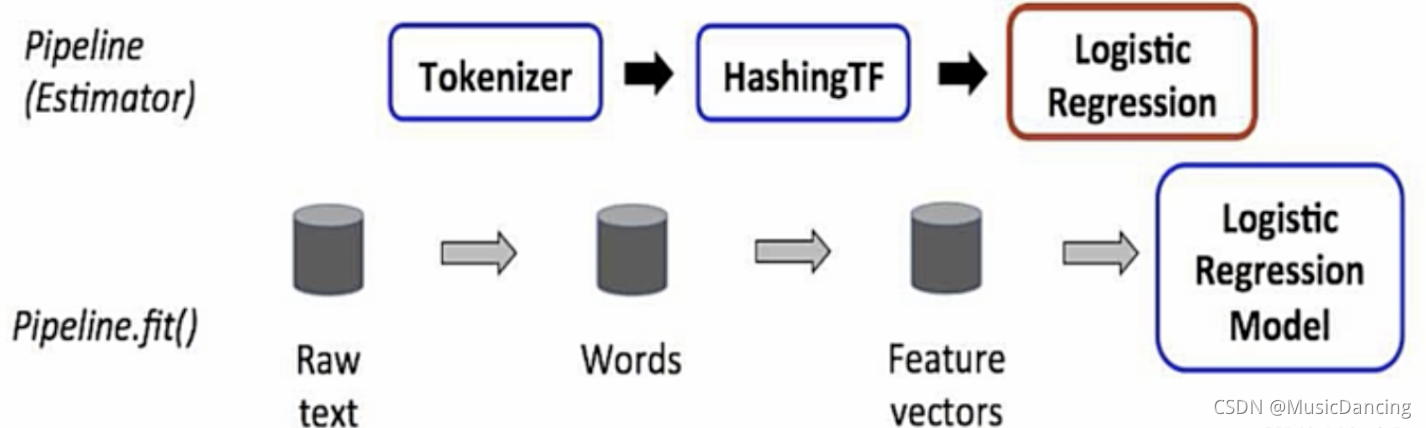 然后就可以把训练数据集作为输入参数,调用pipeline.fit()来开始以流的方式处理源训练数据,并返回一个PipelineModel,进而被用来预测测试数据的标签。(Pipeline本身也可以看作一个Estimator,而Pipeline Model是一个Transformer。)