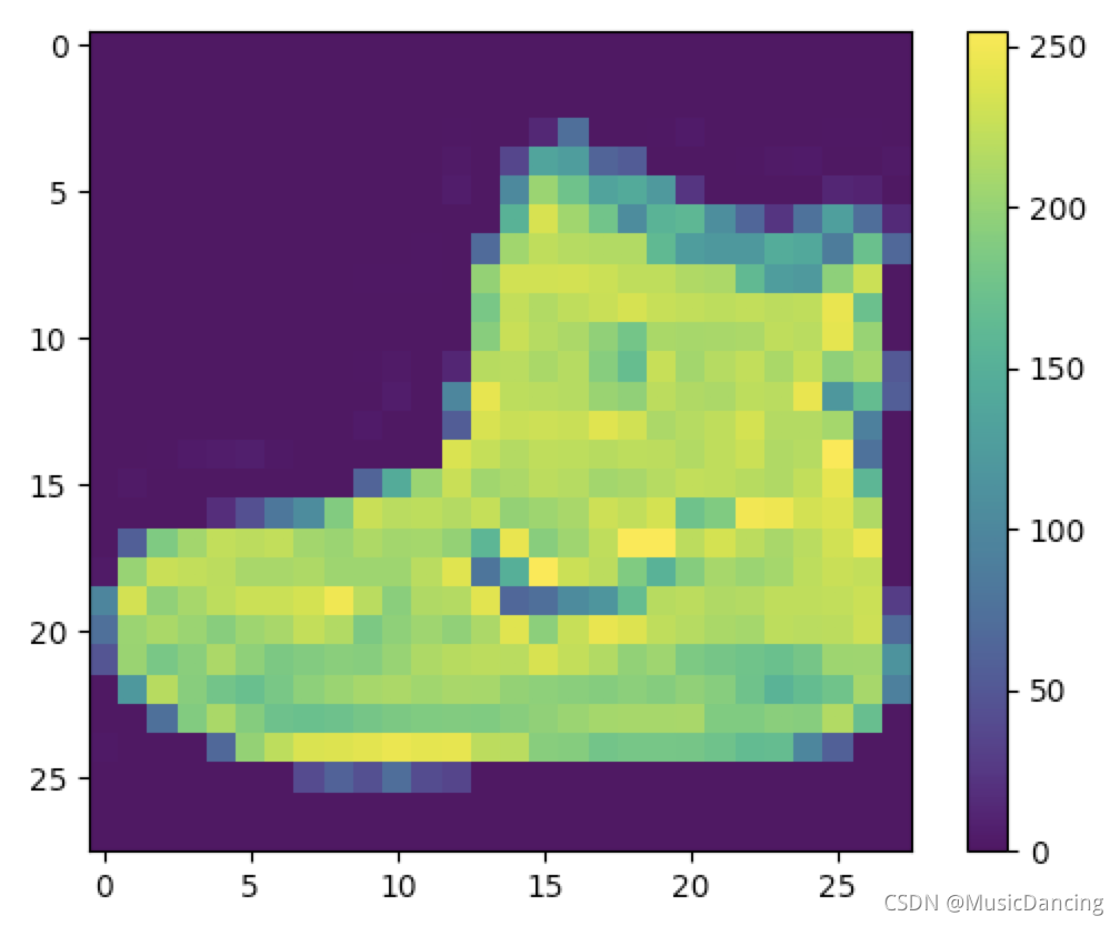 在训练网络之前,必须对数据进行预处理。如果您检查训练集中的第一个图像,您会看到像素值处于 0 到 255 之间: