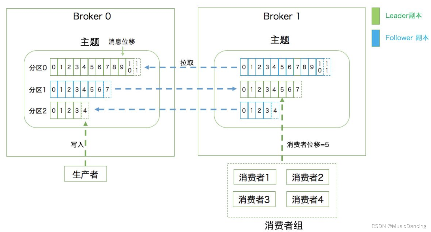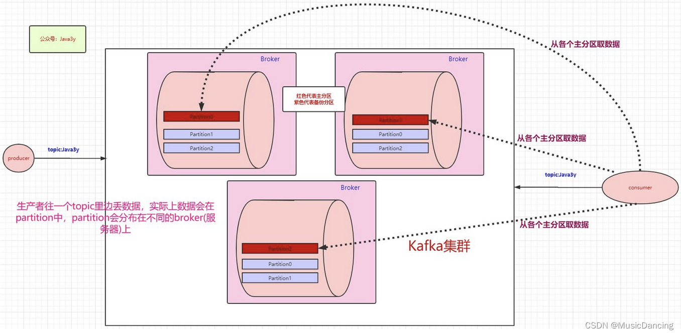 生产者往topic丢数据,消费者消费topic的数据,都是与主分区交互。备份分区仅仅用作于备份,不做读写。如果某个Broker挂了,那就会选举出其他Broker的partition来作为主分区,这就实现了高可用。之后被修复过来的前主分区将作为备份分区了。