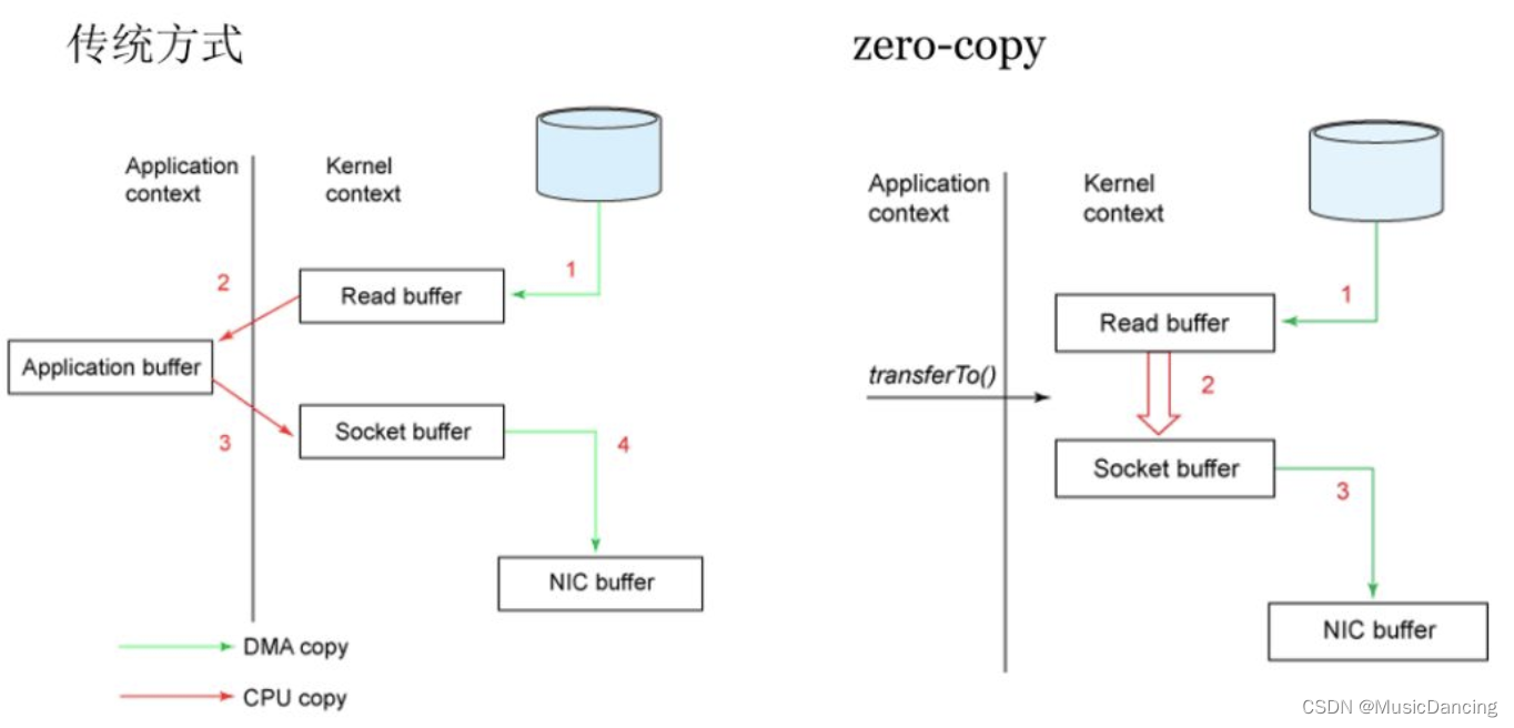 消费者读数据很有讲究:正常的读磁盘数据是需要将内核态数据拷贝到用户态的,而Kafka 通过调用sendfile()直接从内核空间(DMA的)到内核空间(Socket的),少做了一步拷贝的操作。