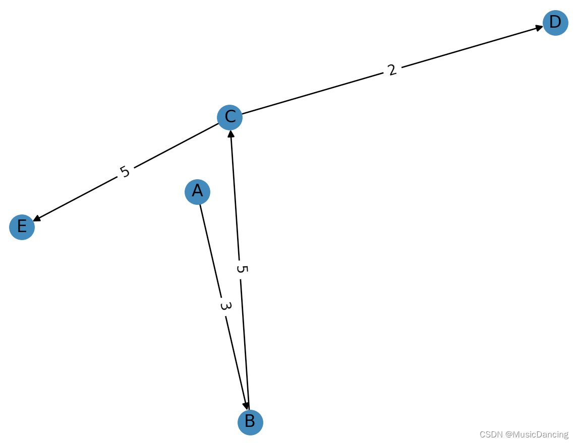 # {('A', 'B'): 3, ('B', 'C'): 5, ('C', 'D'): 2, ('C', 'E'): 5}