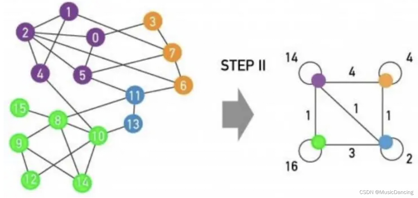 3、1,2两个步骤看做第一阶段,把第一阶段得到的社区视为一个新的节点。重新构造子图,两个节点之间边的权值为相应两个社区之间各边的权值的总和。