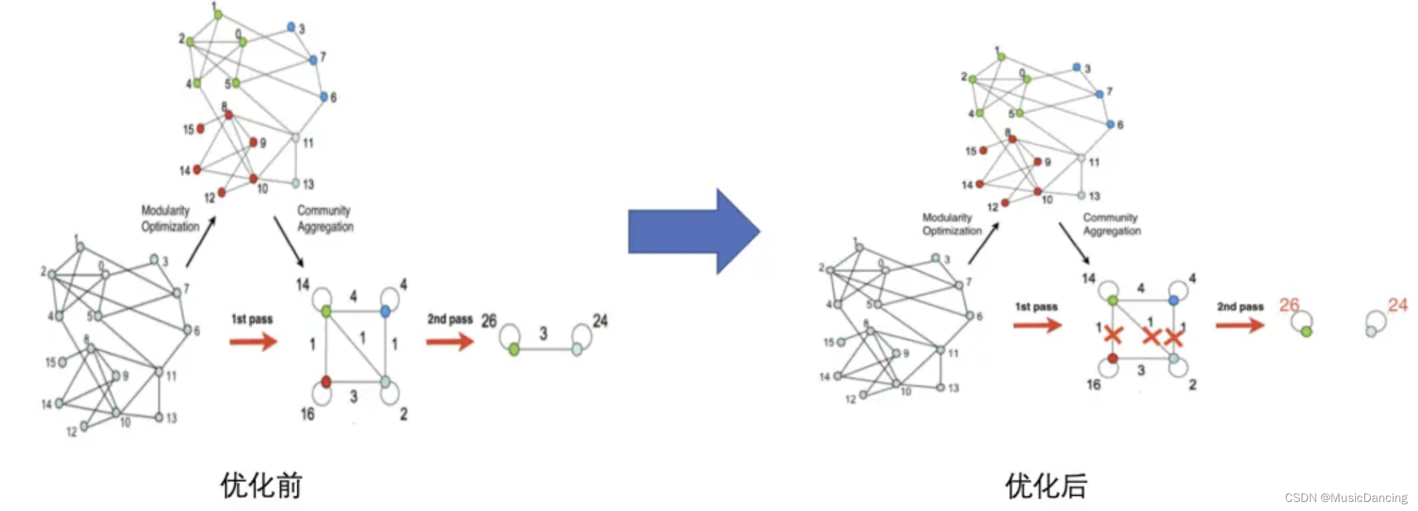 模块度的最优求解本身是个 NP 问题,即时间复杂度为 O(M!),常规数据中无法在短时间内求到最优解。louvain利用贪心算法对求解过程做了一定优化,在此基础上,还可以做以下优化: