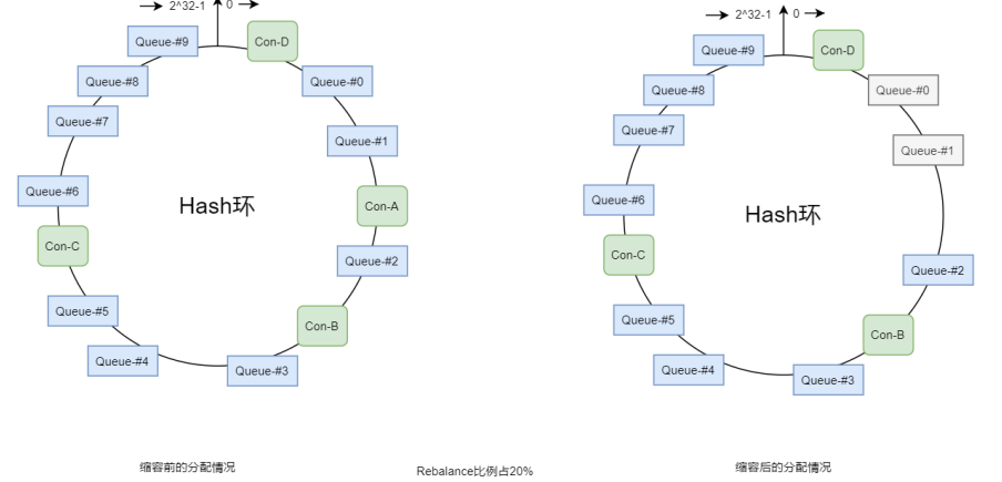 但一致性hash无论扩容还是缩容,只会影响变化的Queue附近的Consumer的分配。