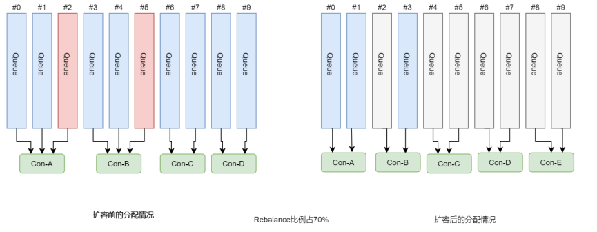 可以看到,平均分配算法在扩容后会连带从头开始的Queue的分配,Rebalance的比例很高