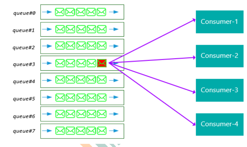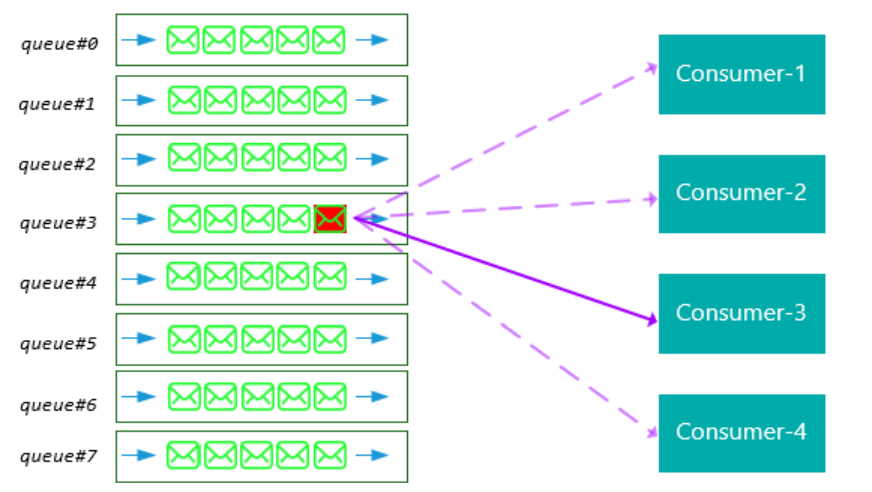 例如,⼀个Topic下5个队列,在只有1个消费者的情况下,这个消费者将负责消费这5个队列的消息。如果此时我们增加⼀个消费者,那么就可以给其中⼀个消费者分配2个队列,给另⼀个分配3个队列,从而提升消息的并行消费能力。