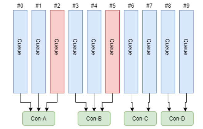只有一个Consumer时,他负责全部的队列。当新增一个Consumer时,原来的不得不停止消费一些队列,然后将这些队列分给新的Consumer,这些停止的队列才能继续消费