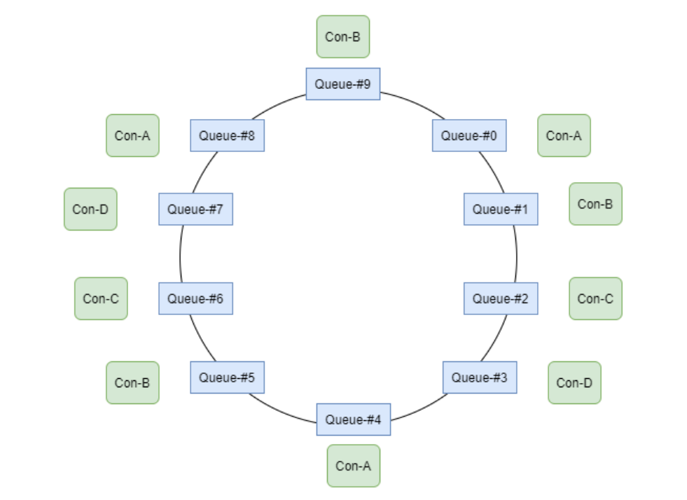 不用事先计算,根据消费者的顺序,依次在由queue队列组成的环形图中逐个分配。