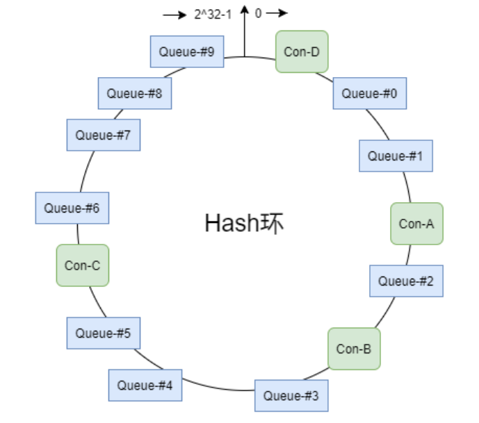 该算法会将consumer的hash值作为Node节点存放到hash环上,然后将queue的hash值也放到hash环上,通过顺时针方向,距离queue最近的那个consumer就是该queue要分配的consumer。