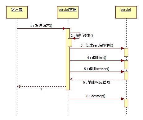 在整个Servlet 的生命周期过程中,创建Servlet 实例、调用实例的init() 和destroy() 方法都只进行一次,当初始化完成后,Servlet 容器会将该实例保存在内存中,通过调用它的service() 方法,为接收到的请求服务。下面给出Servlet 整个生命周期过程的 UML 序列图