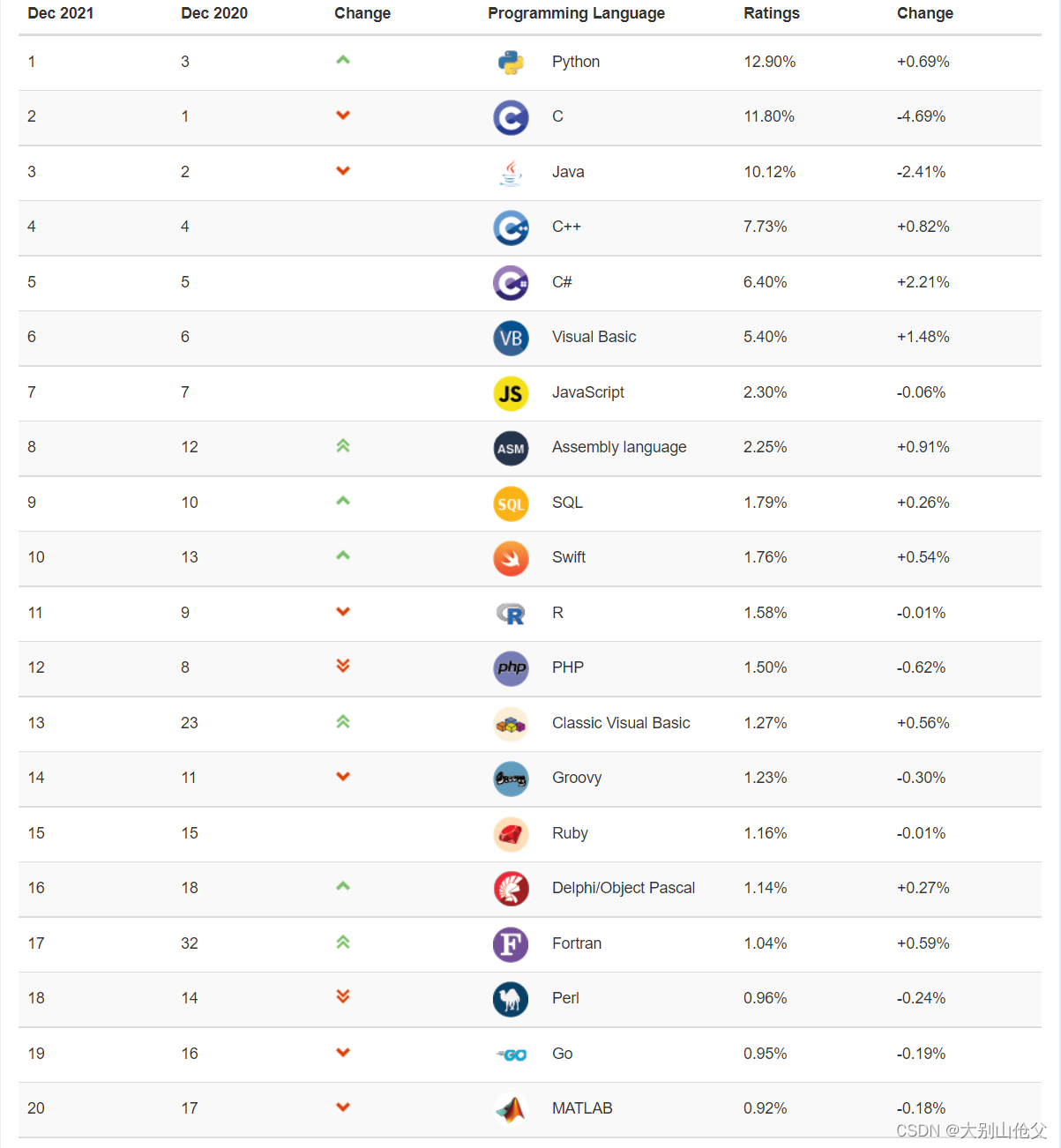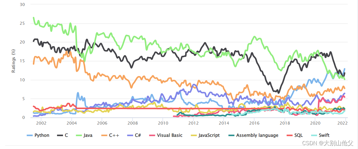 TIOBE编程社区索引是编程语言流行程度的一个指标。该指数每月更新一次。排名依据的是全球熟练工程师的数量、课程和第三方供应商的数量。流行的搜索引擎如谷歌,Bing, Yahoo!,维基百科,亚马逊,YouTube和百度被用来计算流行度。需要注意的是,TIOBE索引并不是关于最好的编程语言或编写大多数代码的语言。