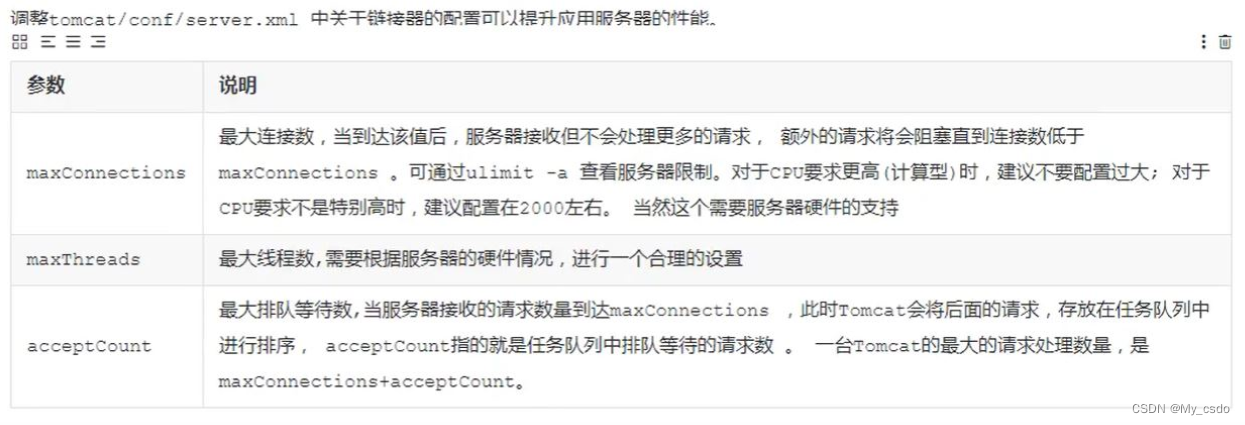 tomcat性能调优主要通过以下几方面: jvm内存配置、jvm垃圾回收配置、链接器配置,其实主要还是jvm的配置。b站链接
