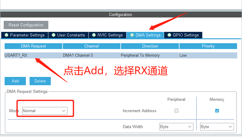 加上DMA的好处就是,你的stm32在接收数据时,只用产生一次空闲中断,就可以获得你的一帧数据了。而不用在频繁去判断。废话不多说,上配置: