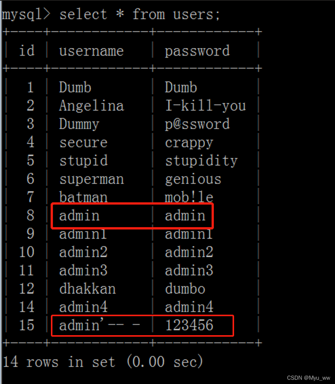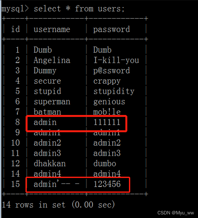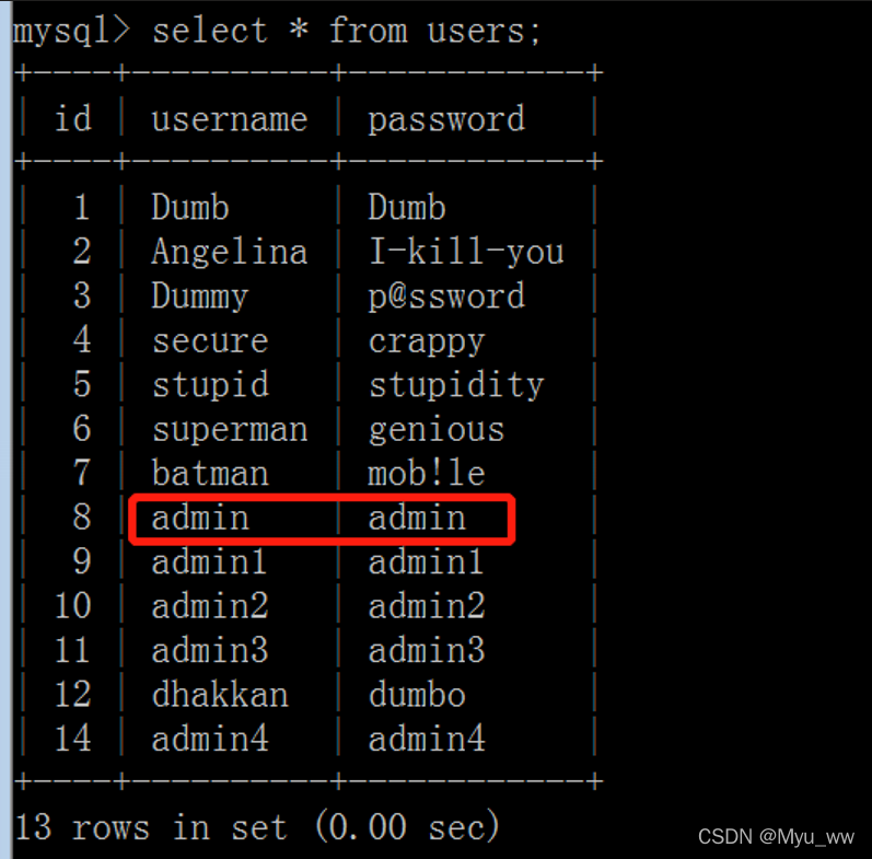 再一次查看 users 表,发现用户 admin‘-- - 的密码并没有被修改,而是用户 admin 的密码被修改了。于是我们就有了 admin 的账户密码。
