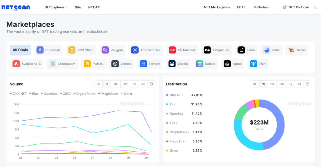 本周:大部分交易市场走势较为平稳,整体交易额在 10 月 28 日达到最高,OKX NFT 市场最高达 1572.5 万美元,NFTScan 收录 191 个交易市场 7d 总交易额 $223m,较上周有一定回暖($199.5m),本周 OKX NFT 交易额排名第一,市场交易额分布较稳定,排名前六的交易市场及占比分布: