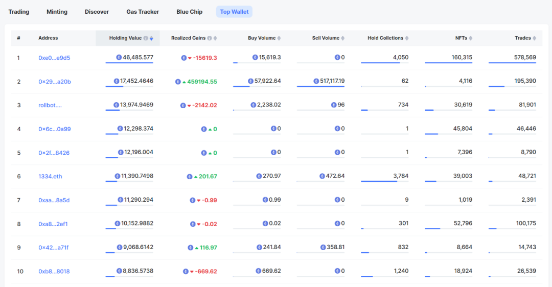 NFTScan 对排名前 1000 的 NFT 持仓价值钱包地址进行了分析,当前持有价值排名前 10 如下图所示: