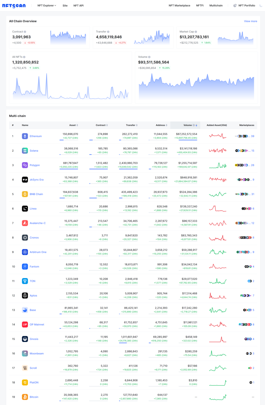 截至 2023 年 10 月 30 日,NFTScan 目前已支持 Bitcoin、Ethereum、BNBChain、Polygon、Solana、Avalanche、Arbitrum、Optimism、zkSync、Aptos、Linea、Base、TON、Scroll、Fantom、Moonbeam、PlatON、Cronos、Gnosis 19 条主流区块链网络共产生: