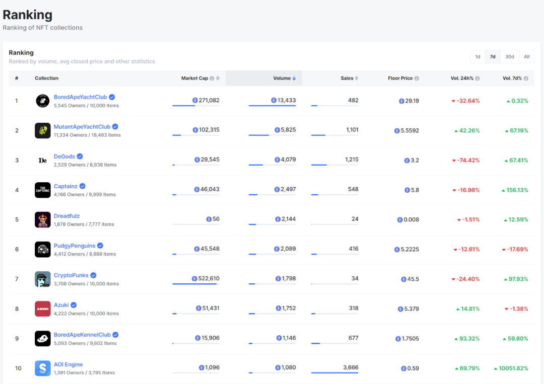 Ethereum 网络上最热门、交易量最高的 Top 10 NFT 项目如下图所示:
