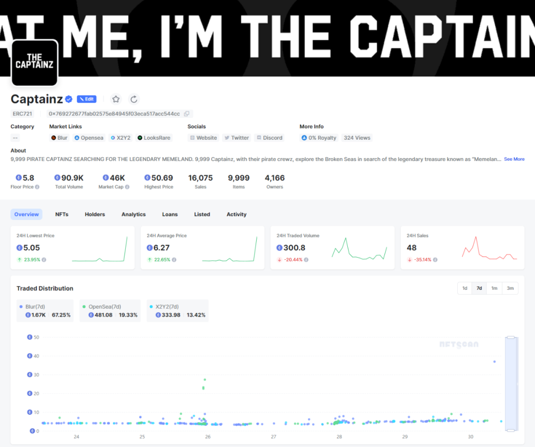 据数据显示,目前以太坊上 Captainz 的链上总交易额已超 90.9k ETH,目前地板价为 5.8e,过去 7 天交易分布主要为 Blur(67.25%),Opensea(19.33%),X2Y2(13.42%)。过去 7 天交易额 2.6k ETH,交易笔数 572。
