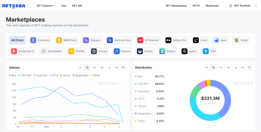 本周:大部分交易市场走势较为平稳,整体交易额在 11 月 2 日达到最高,Blur 市场最高达 1684.1 万美元,NFTScan 收录 194 个交易市场 7d 总交易额 $221.3m,较上周持平($223m),本周 Blur 交易额排名第一,市场交易额分布较稳定,排名前六的交易市场及占比分布: